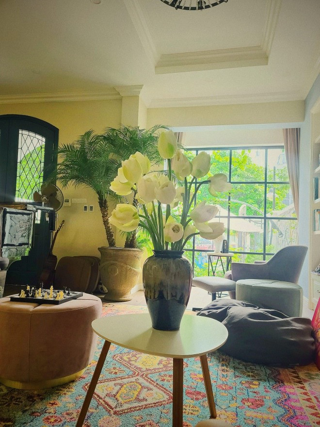 Được biết, hiện tại gia đình cô đang sốngtrong một căn nhà rất sang trọng, có diện tích khoảng 160m2. Vì cảhai vợ chồng cô đều thích nội thất có màu sắc mạnh, đồ cổ, vintagenên mất rất nhiều công sức đi tìm kiếm những món đồ ưng ý.