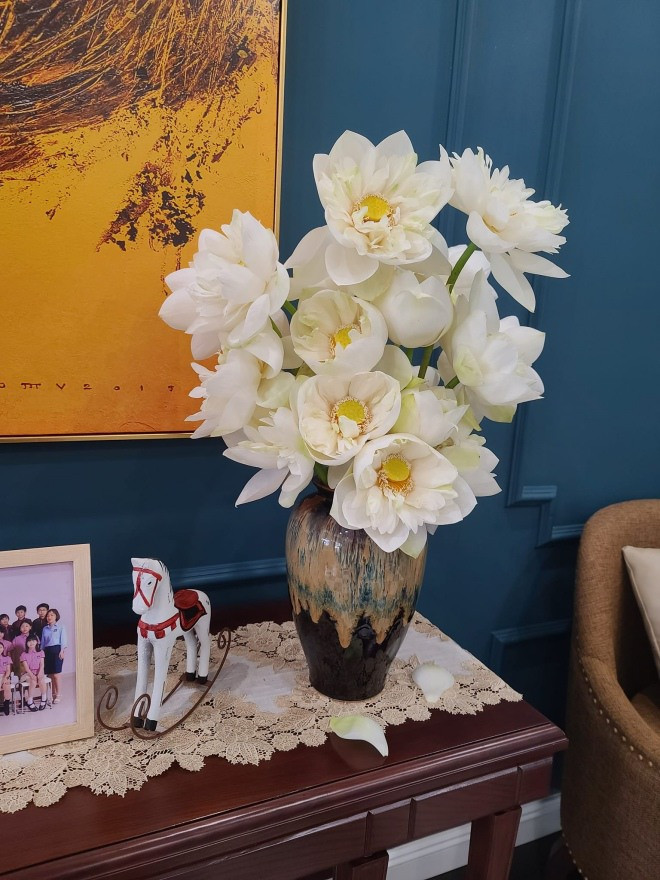 Cô cũng đầu tư rất nhiều lọ hoa khác nhau, chủyếu là chất liệu gốm với các màu sắc đậm, tạo cảm giác hoài cổ.