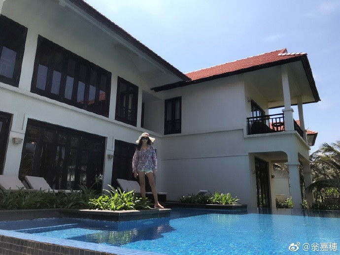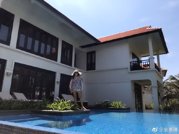 Trên weibo cá nhân, người đẹp hào hứng khoe ảnh dạo biển Mỹ Khê trong trang phục gợi cảm.