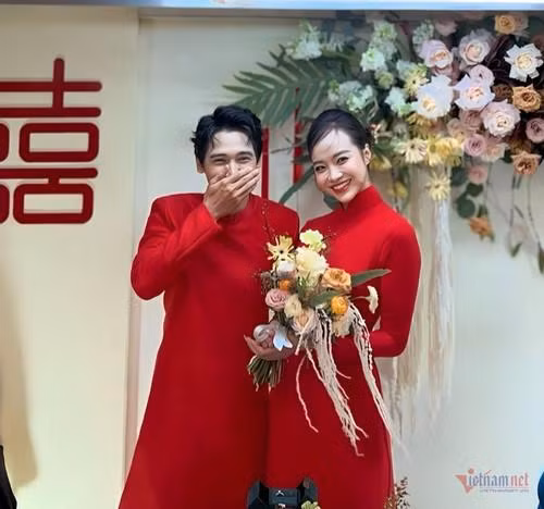Hoa hậu Kiều Ngân và Tronie Ngô hạnh phúc, rạng rỡ trong ngày trọng đại. Cặp đôi diện áo dài đỏ nổi bật, thiết kế kiểu truyền thống. Trước sự chứng kiến của gia đình, bạn bè thân thiết, cả hai xúc động, trao nhau ánh mắt, cử chỉ ngọt ngào.