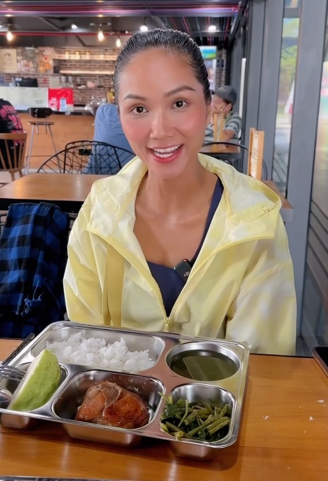 Có hôm không nấu, cô vẫn hào hứng khoe phần cơm của mình:"Bữa trưa của Hen sẽ có gì?" Trong đó có món quen thuộc của cô là thịt gà, bên cạnh đó là rau uống, canh bồ ngót, ổi tráng miệng. Hoa hậu cho biết: "Bình thường Hen hay ăn rau luộc, ít khi nào có món kho hay là chế biến kỹ".