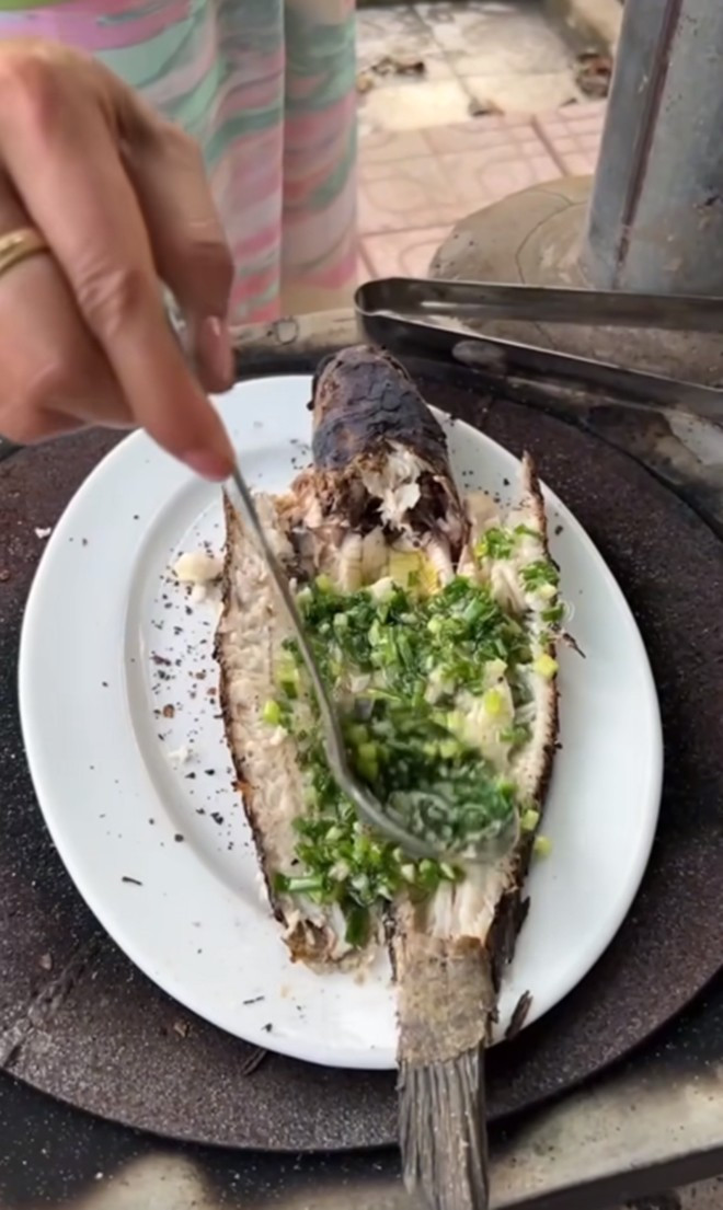 Cô cho biết, cá nướng sơ sơ sau đó sẽ mở ra và rưới mỡ hành lên trên. "Cái này là Hen được chỉ thôi chứ ở nhà Hen ít làm món này lắm. Món này là cách ăn ở Cần Thơ và mọi người chia sẻ như vậy. Ngon!", nàng hậu nói.