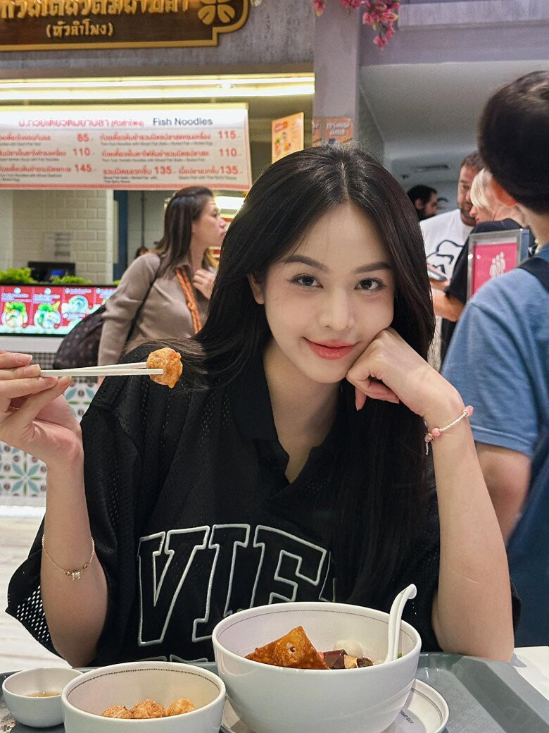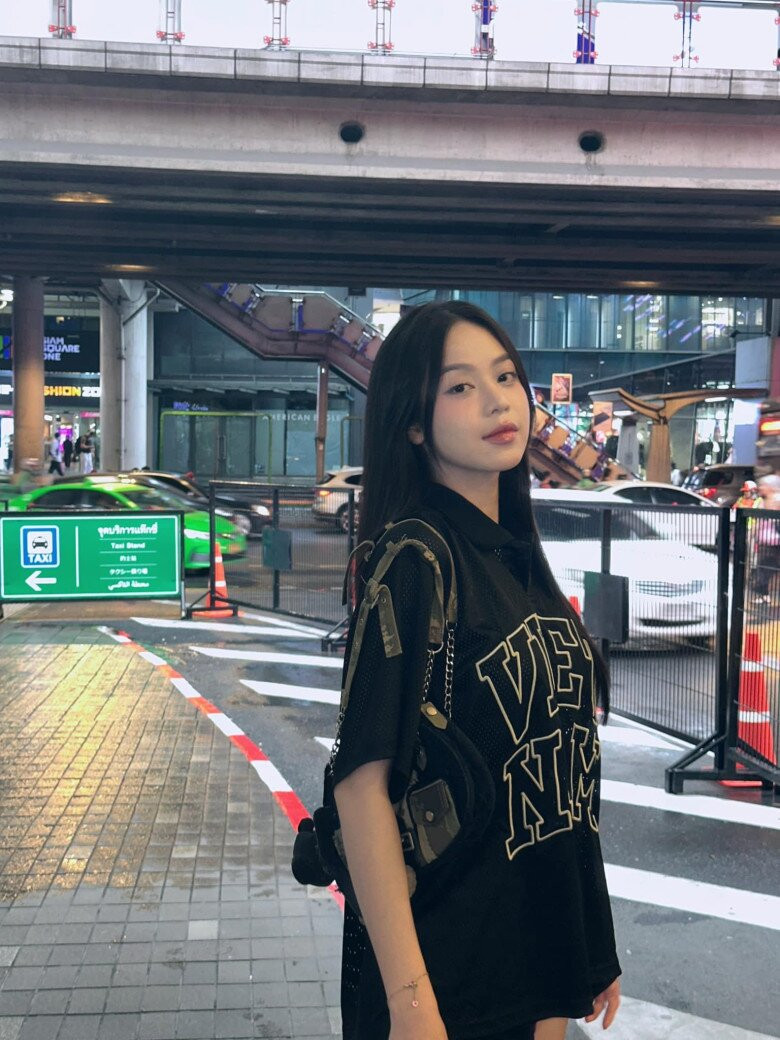 Thanh Thủy diện đồ đơn giản, trẻ trung và ai cũng khen nàng hậu khéo léo khi chọn mặc chiếc áo thun đen có in chữ Việt Nam rất nổi bật, để ai cũng biết Miss International 2024 đến từ Việt Nam.
