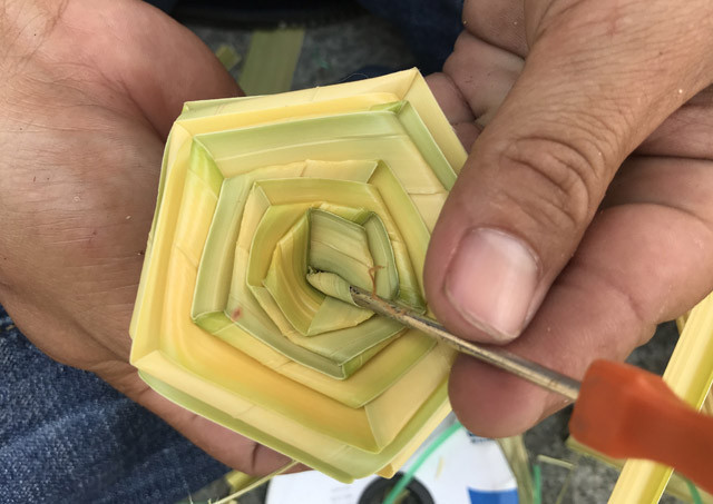 Những ngày qua tại khu vực gần ngã tư Hùng Vương - Phan Bội Châu, Tp.Quảng Ngãi, bên cạnh những cửa bán hoa tươi thường thấy, dễ bắt gặp hình ảnh những người đàn ông lặng lẽ bên chiếc bàn nhỏ bày bán những bông hoa "lạ" của mình. Chỉ bằng một vài động tác uốn cong, gấp vòng...những lá dừa nước vàng tươi đã trở thành bông hồng xinh xắn có màu trắng sữa thật đẹp.