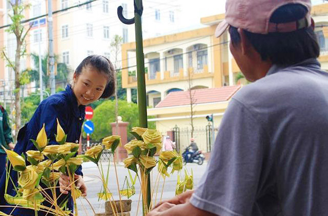 Chỉ sau chừng mươi phút dưới bàn tay khéo léo của người thợ, những chiếc lá dừa nước đã trở thành bông hoa có màu sắc lạ và hình thức đẹp không kém gì thật, thu hút nhiều người đi đường, đặc biệt là giới trẻ ghé lại mua về trưng bày trong nhà, tặng người thân của mình.