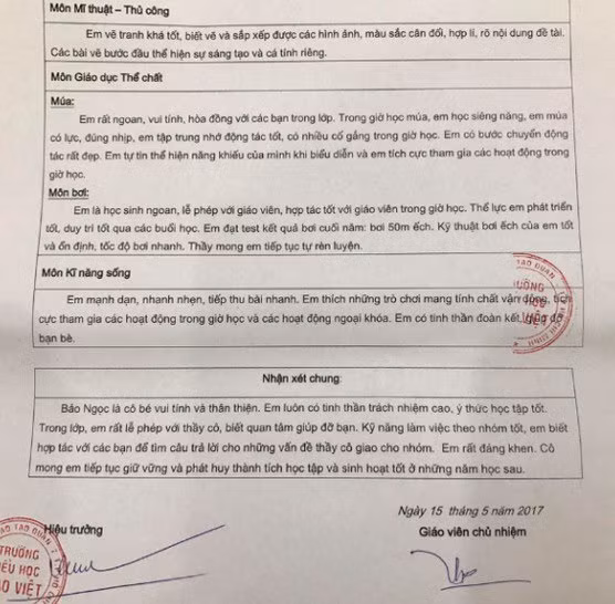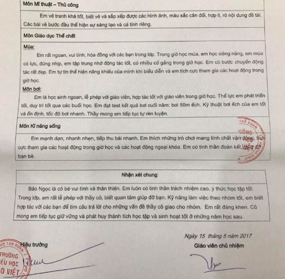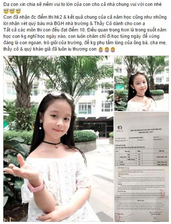 Hay trong một lần khác mẹ bé cũng hào hứng khoe với mọi người thành tích tốt của con gái trong năm học và những lời nhận xét từ thầy cô trong trường về từng môn học.