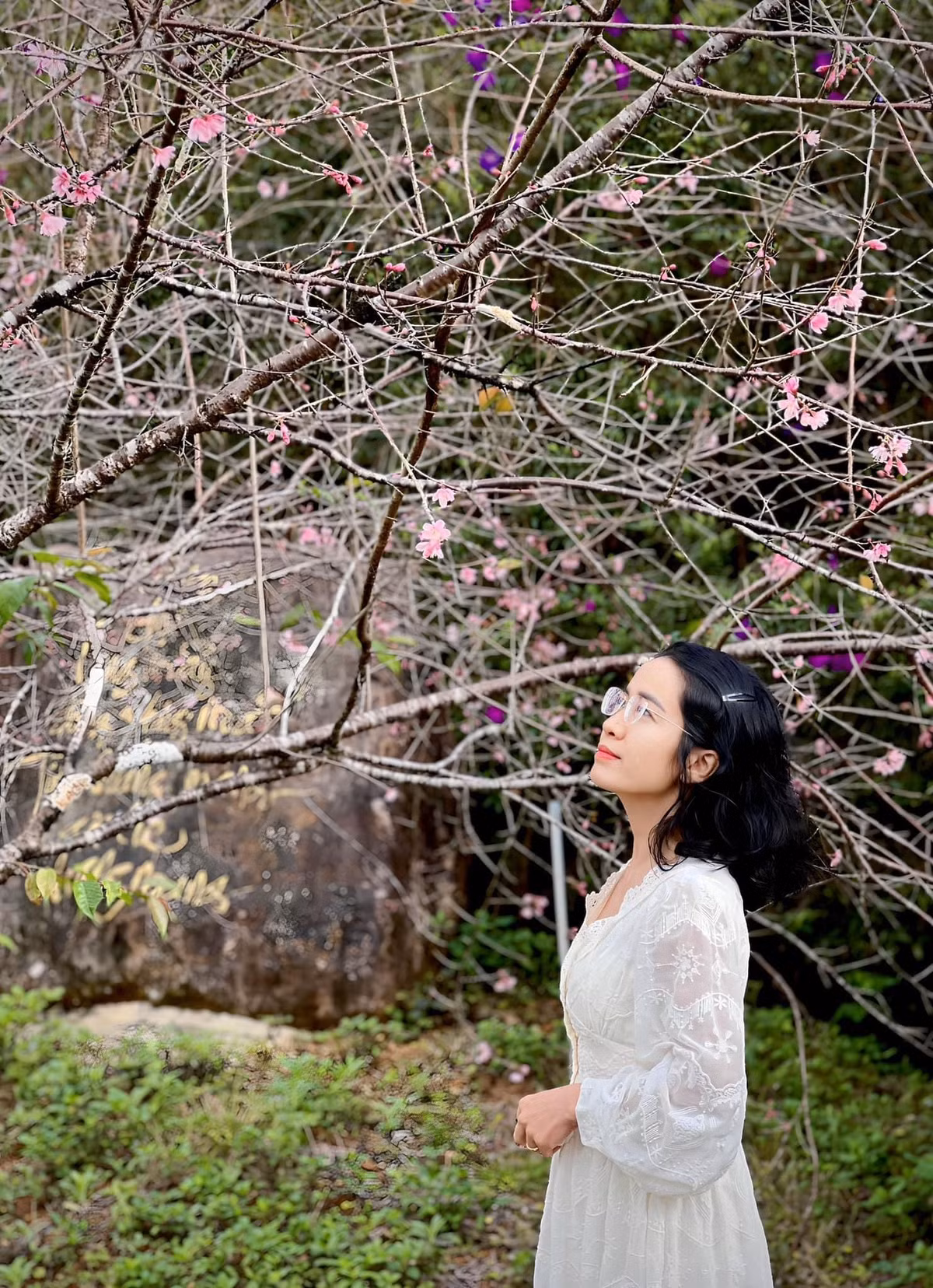 Bạn Mai Ly tranh thủ "săn ảnh" hoa đào tại Quảng trường thị trấn Măng Đen trước khi hoa tàn.