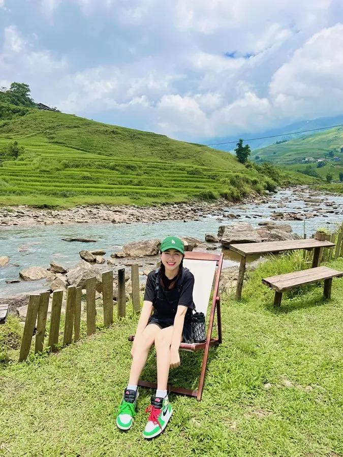 òa Minzy chụp hình nhí nhảnh khi đi xem SEA Games 31 để lộ cánh tay gầy gò.