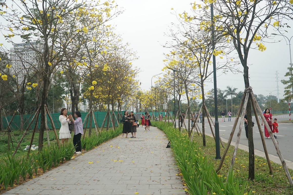 Cuối tháng 2, hàng cây Phong Linh ở khu đô thị thuộc phường La Khê, Hà Đông, Hà Nội lại khoe sắc, nở vàng một góc trời, thu hút đông đảo người dân đến chụp hình.