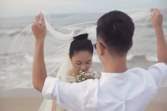 Ảnh cưới lãng mạn trên bãi biển của Hoàng Quyên.