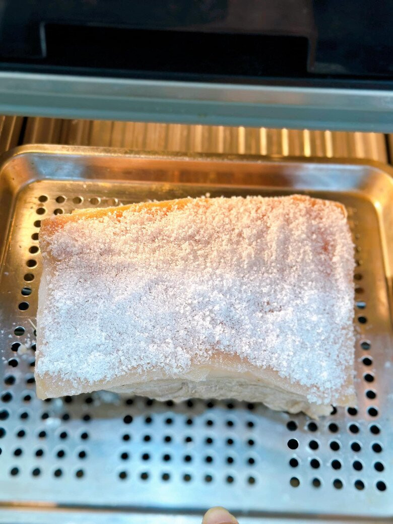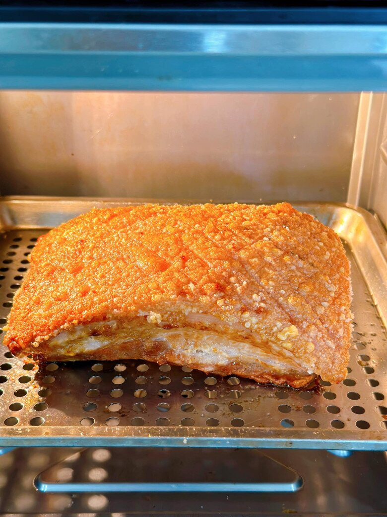 - Nướng muối xong, gỡ bỏ sạch phần muối đi rồi cho lại vào lò nướng 220 độ 20 phút, lúc này da giòn đều và để từ trưa đến chiều vẫn giòn.