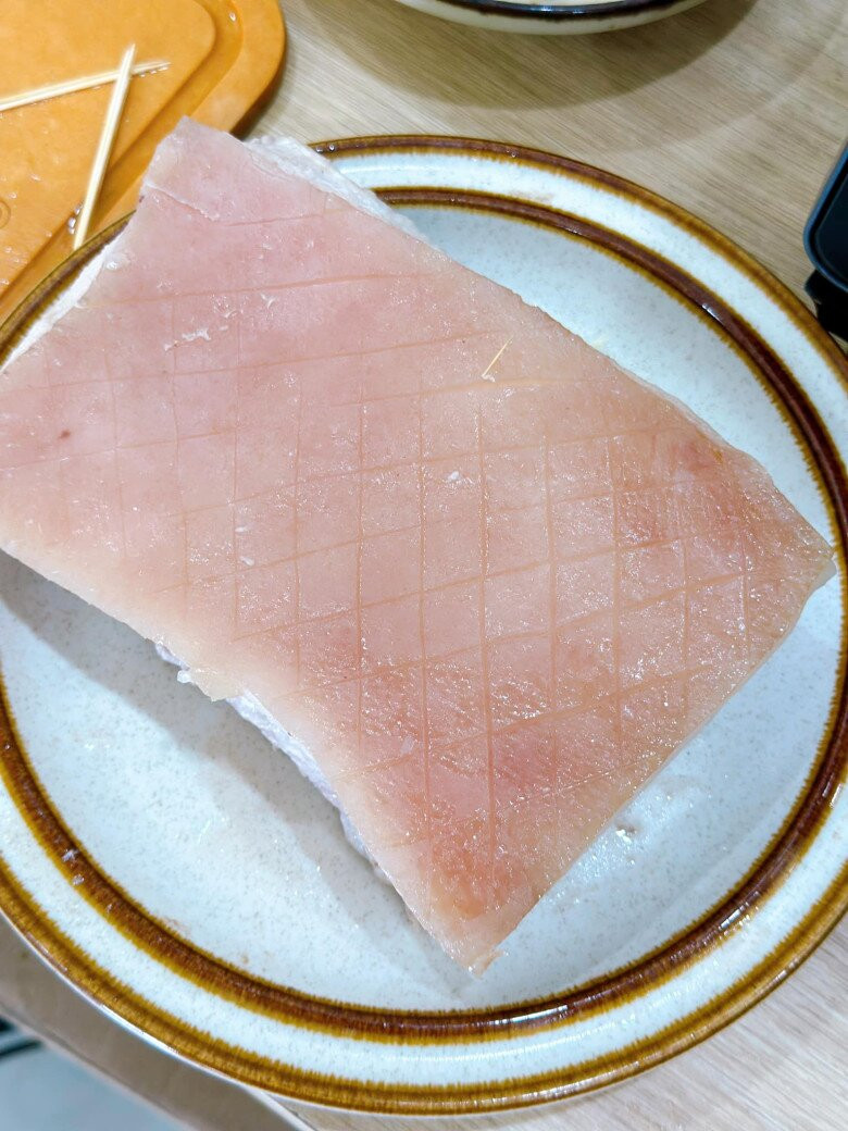 - Thịt hấp xong dùng tăm đâm phần bì thật đều sau đó sẽ khứa hình caro. Lưu ý không khứa sâu quá.
