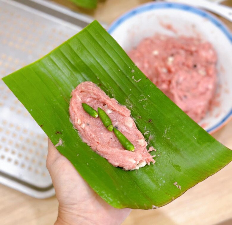Sau đó phết một ít dầu ăn vào lá chuối, cho chả bò vào, gói lại rồi đem hấp 30 phút là chả chín.