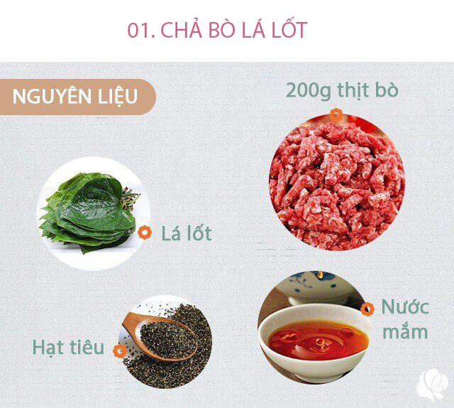 Nguyên liệu: - Thịt bò: 200g - Thịt lợn: 200g (½ trong đó là thịt mỡ) - Lá lốt: 1-2 bó (loại lá to, còn tươi, đẹp) - Hành tím: vài củ - Sả: 2 cây - Tỏi: vài nhánh - Ớt: 3-5 trái - Đậu phộng: 100g - Các gia vị cần thiết: Nước mắm nêm, đường tiêu, muối, dầu ăn, xì dầu …