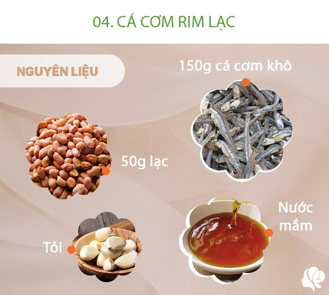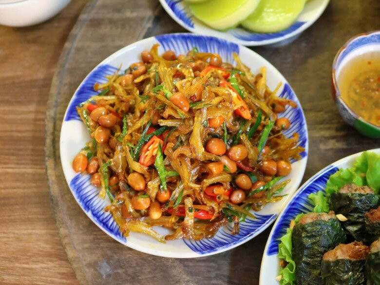 Nguyên liệu: 150g cá cơm sữa, 50g lạc, vừng rang, hành lá, tỏi, ớt, mắm, đường, tương ớt, ớt tươi, dầu ăn.