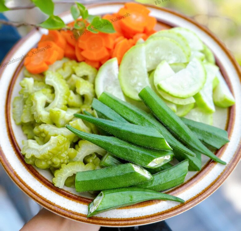 Đun sôi nồi nước với cà rốt và một chút muối, sau đó thả thêm đậu bắp, vào, luộc 1 phút thì cho mướp đắng và bầu. Luộc thêm khoảng 2-3 phút nữa là vớt tất cả ra đĩa.