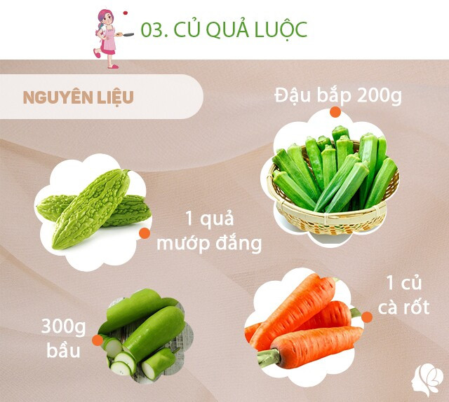 Chuẩn bị: 1 củ cà rốt gọt vỏ, thái miếng mỏng vừa; 1 quả mướp đắng bỏ ruột thái miếng rửa sạch, 300g bầu gọt vỏ, thái miếng vừa ăn; đậu bắp rửa sạch; muối.
