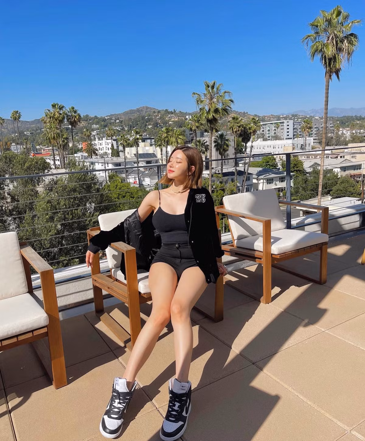 Lúc khác cô lại diện những bộ đồ mang hơi hướng thể thao. Tất nhiên, dù mặc rộng nhưng cô vẫn tạo điểm nhấn cho trang phục bằng cách kết hợp thêm với item có dáng bó.