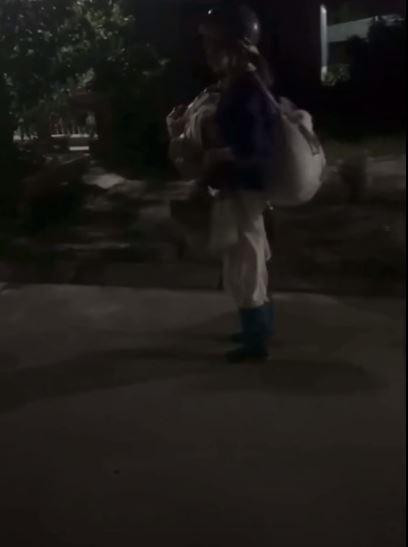 Hình ảnh ghi lại, cô mang theo rất nhiều đồ đạc lỉnh kỉnh giữa đêm khuya vắng người. Trên đầu Bella còn đội thêm một chiếc mũ bảo hiểm vì đang di chuyển bằng xe đạp điện.