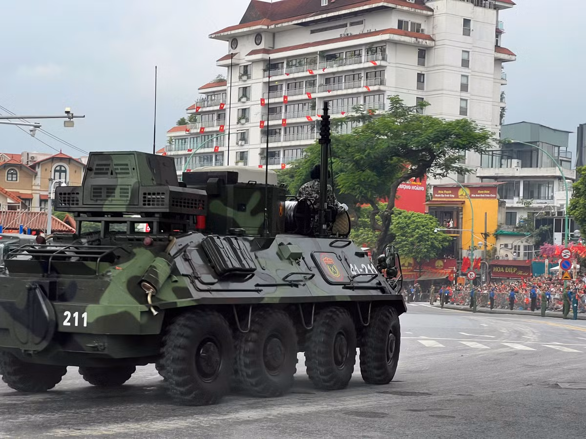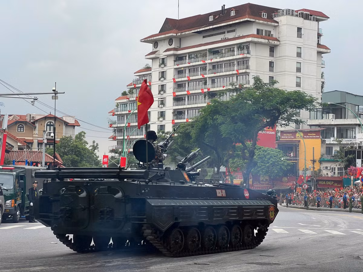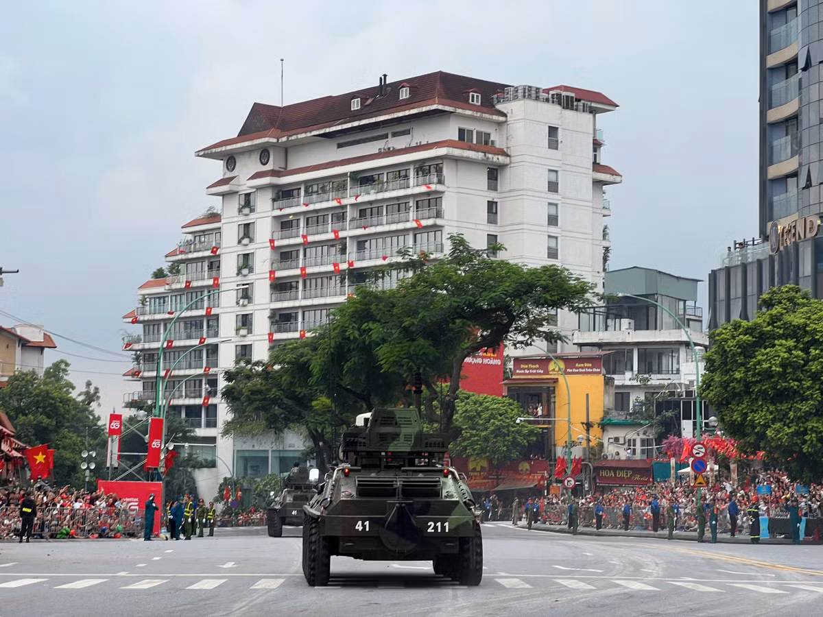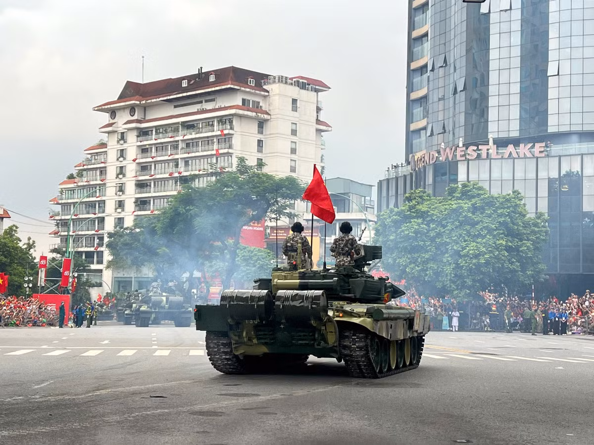 Âm thanh từ động cơ và bánh xích sắt của những cỗ xe thép vang vọng khắp không gian, như hòa nhịp cùng sự háo hức của hàng nghìn người xem sơ duyệt diễu binh.