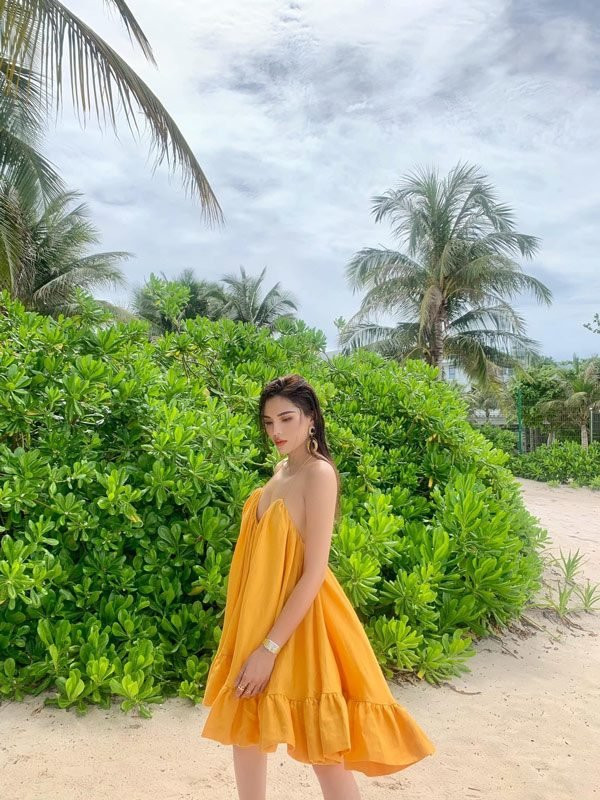 Đâu chỉ có Kỳ Duyên, H'Hen Niê cũng hết sức toả nắng theo đúng tinh thần của mùa hè. Người đẹp Ê Đê cũng chọn một thiết kế váy cổ kiểu yếm, hở lưng với thân bồng bềnh tạo cảm giác quyến rũ.