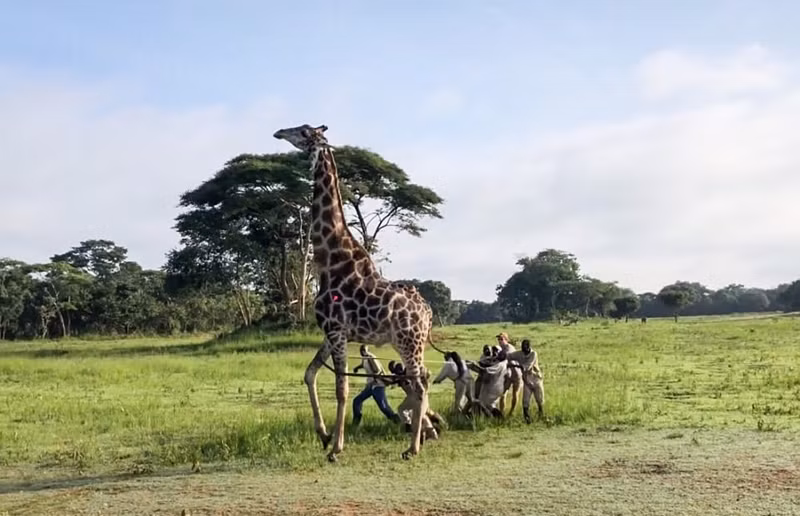 Sau khi phát hiện ra sự việc, các nhân viên bảo tồn, nhân viên cứu hộ lập tức có mặt và tiến hành giải cứu con hươu cao cổ tội nghiệp.