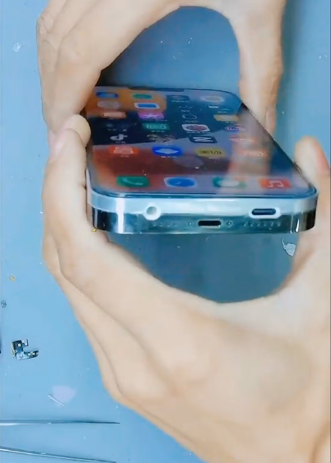 Tiếp theo, một khung kim loại được gắn lên trên khung gốc của iPhone để chứa viên pin thứ 2 và các thành phần bổ sung, khiến độ dày của iPhone 13 Pro Max tăng gấp đôi. Changshun phải mài một phần khung thép để gắn cổng USB-C và giắc tai nghe 3,5 mm.