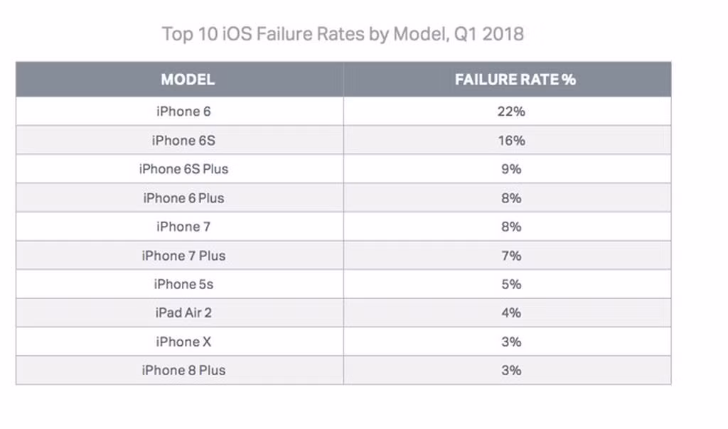 Theo như báo cáo, thì những thiết bị iOS hiện nay gặp lỗi nhiều nhất ở mô-đun Bluetooth và Wifi, sau đó là chip nhận sóng, tất cả đều ảnh hưởng lớn tới việc sử dụng của thiết bị. Tỉ lệ hỏng hóc của iPhone vẫn thấp hơn so với những smartphone đến từ đối thủ Samsung. Theo Blancco, điện thoại của Samsung có tỉ lệ hỏng lên tới 27,4%, tức trong 4 chiếc điện thoại của hãng này thì có hơn 1 chiếc gặp vấn đề.