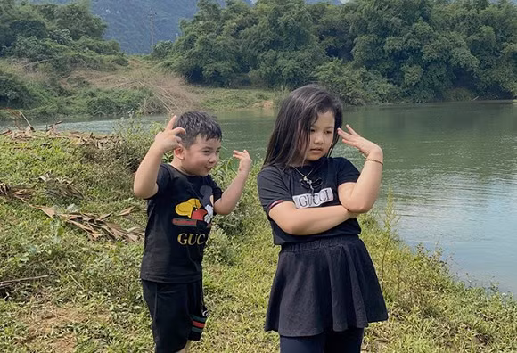 Hai nhóc tì nhà nàng hậu tỏ ra rất hào hứng khi được về Hòa Bình chơi cùng bố mẹ sau thời gian dài ở nhà tránh dịch. Bé Nấm - con gái út của cô - mới được vài tháng tuổi nên được gửi cho người nhà chăm sóc ở Hà Nội.