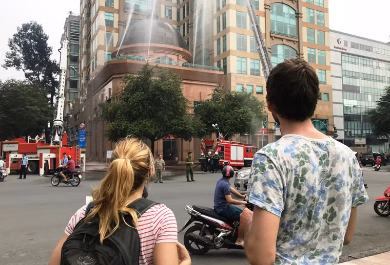 Khách nước ngoài thích thú dùng ĐTDĐ ghi lại hình ảnh diễn tập chữa cháy ở trung tâm TP.HCM.