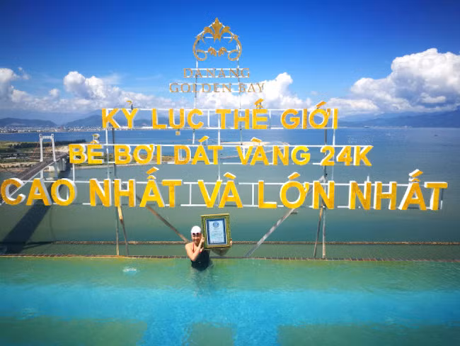 Không chỉ các vật dụng trong phòng, khách sạn tại Đà Nẵng còn nổi tiếng bởi bể bơi dát vàng đặt trên tầng 29. Bể bơi đã được tổ chức Liên minh Kỷ lục Thế giới (WorldKings) xác nhận và công bố là Bể bơi vô cực dát vàng 24K cao và lớn nhất thế giới hiện nay.