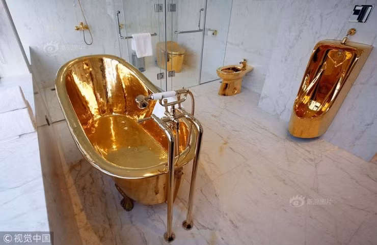 Ngay cả những chi tiết trong nhà vệ sinh như bồn rửa mặt, vòi nước, đĩa đựng... cũng đều được dát vàng tinh vi. Nhiều người đặt ra câu hỏi hài hước: liệu khách có e ngại khi đi vệ sinh trên một chiếc bồn cầu quý giá như vậy?