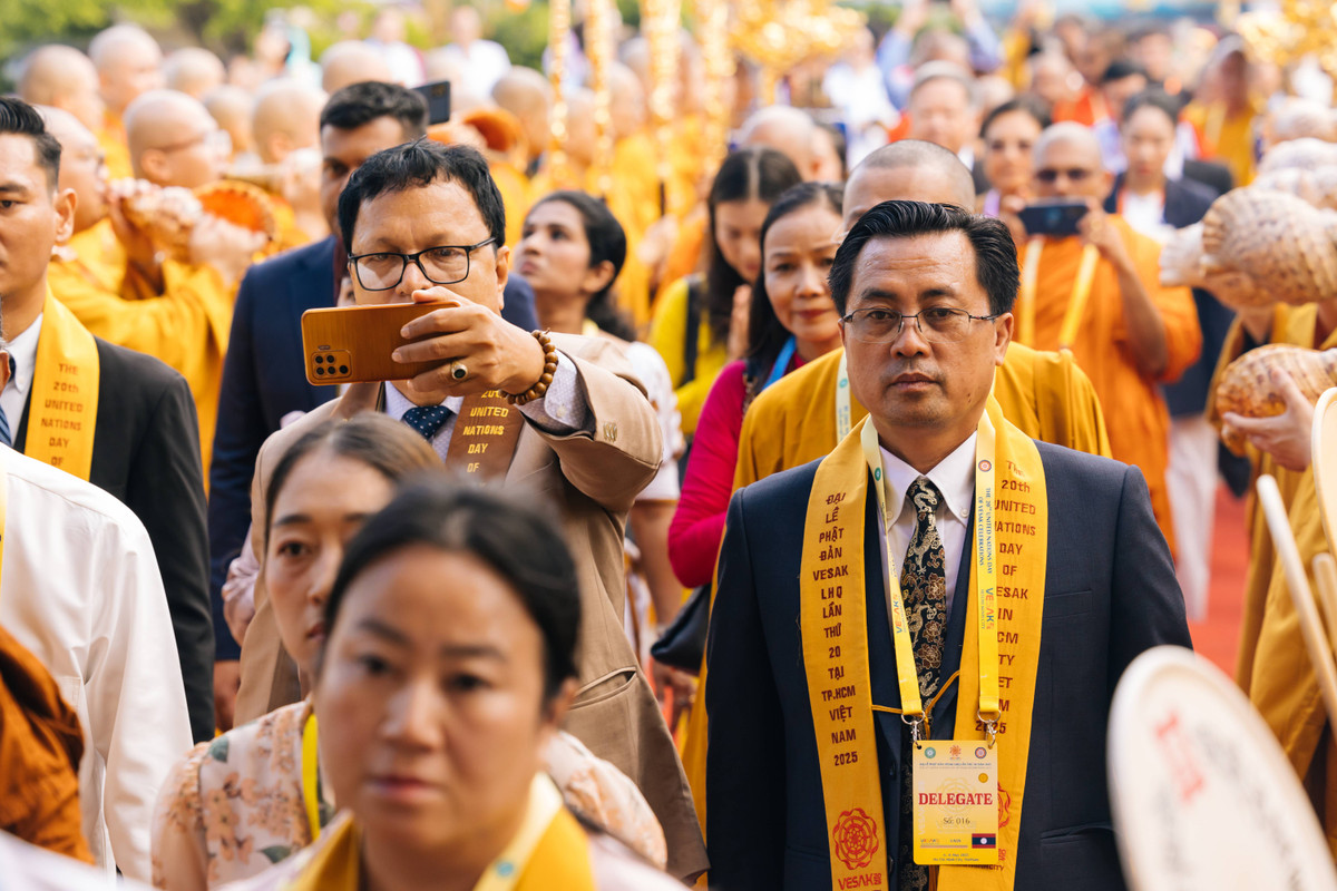 Từ các đoàn quốc tế với trang phục truyền thống đặc sắc, đến những vị cao tăng uy nghiêm trong sắc y vàng rực, tất cả cùng hiện diện trong tinh thần hòa hợp, đoàn kết và tôn kính Đức Phật.