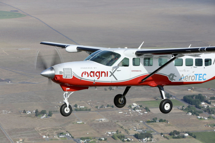 Máy bay điện 9 chỗ eCaravan, kết quả hợp tác giữa công ty động cơ MagniX và công ty hàng không AeroTEC bay phía trên thành phố Moses Lake thuộc bang Washington dưới sự điều khiển của một phi công thử nghiệm và theo sau là một chiếc máy bay hộ tống nhỏ.