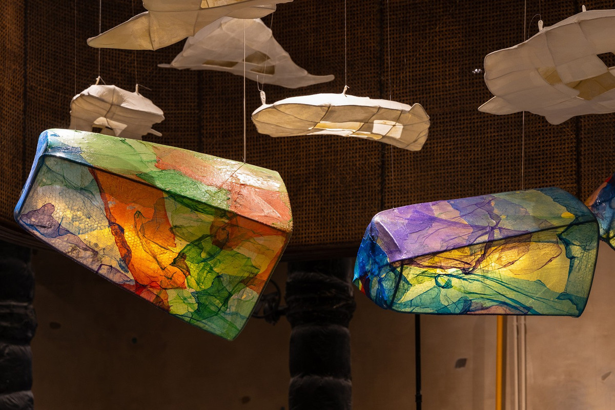 Túi nhựa và giấy dó được sử dụng để tạo nên các tác phẩm nghệ thuật, trang trí cho không gian.