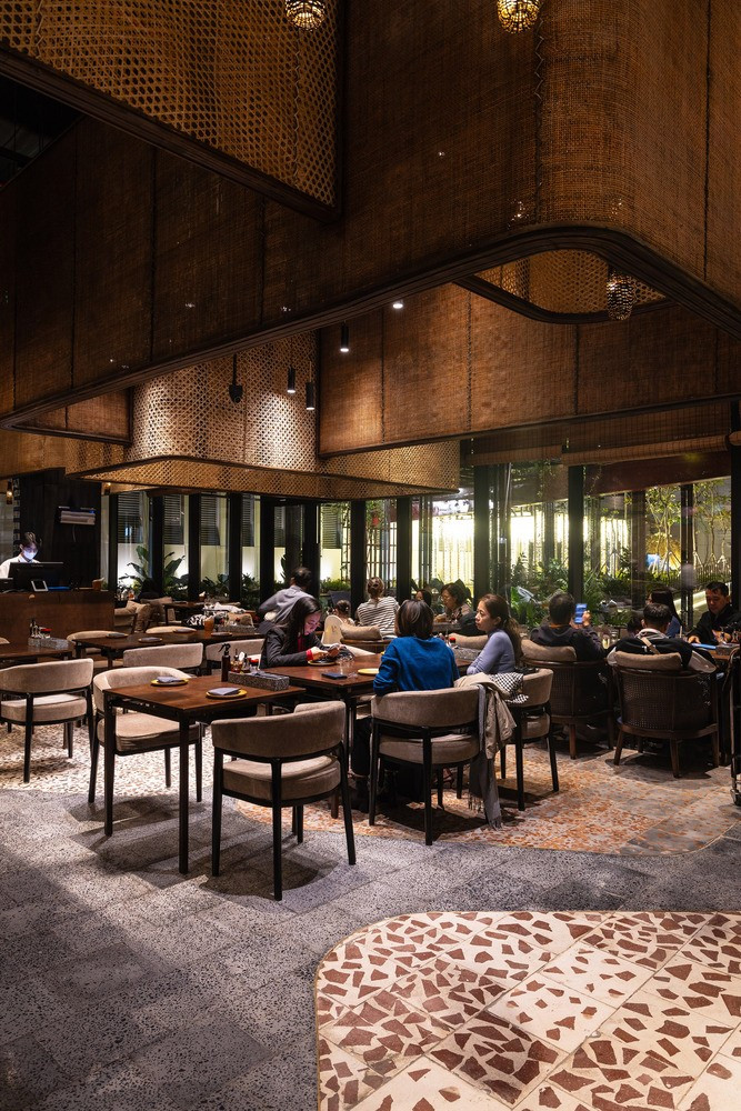 Dự án nhà hàng này là sự tích hợp vật liệu và kỹ thuật có nguồn gốc từ các làng nghề thủ công của Hà Nội.
