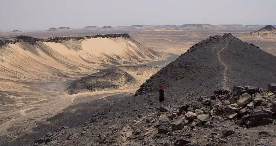Sa mạc đen Ai Cập: Ai Cập là vùng đất sở hữu nhiều cảnh tượng thiên nhiên, công trình cổ đại hùng vỹ. Chỉ tính riêng sa mạc, vùng đất này đã có hai loại ở thái cực khác nhau: sa mạc đen và trắng. Sa mạc đen cách sa mạc trắng khoảng 100 km về phía Đông Bắc. Màu đen của cát được hình thành bởi các vụ núi lửa phun trào. Du khách thường bắt gặp những tảng đá đen lẫn xen kẽ cùng những viên đá nâu vàng.