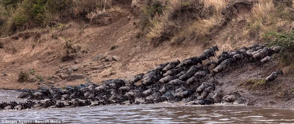 Một trong những thử thách khó khăn nhất của đàn linh dương đầu bò là vượt qua sông Mara với đầy cá sấu đang nằm chờ.