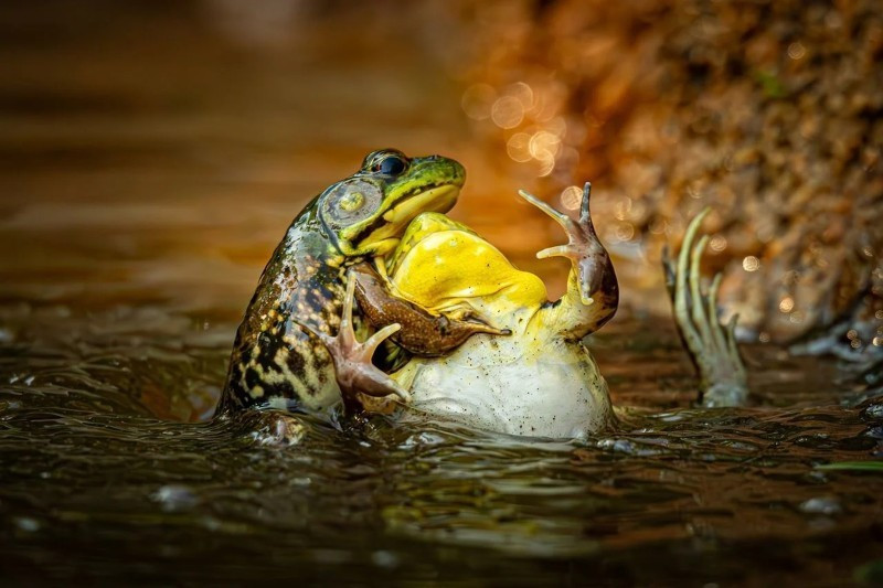 Grayson Bell, 13 tuổi, đến từ Mỹ, đoạt giải ở hạng mục bò sát, lưỡng cư và côn trùng cùng giải dành cho nhiếp ảnh gia trẻ dưới 16 tuổi với bức ảnh 2 con ếch đang vật lộn trong nước, được đặt tên Baptism of the Unwilling Convert.