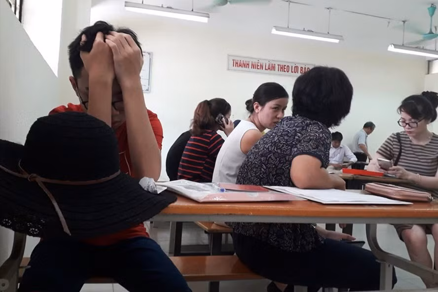 | Phụ huynh chờ đợi xét hồ sơ cho con sau khi nhiều trường ở Hà Nội hạ điểm chuẩn lớp 10. |