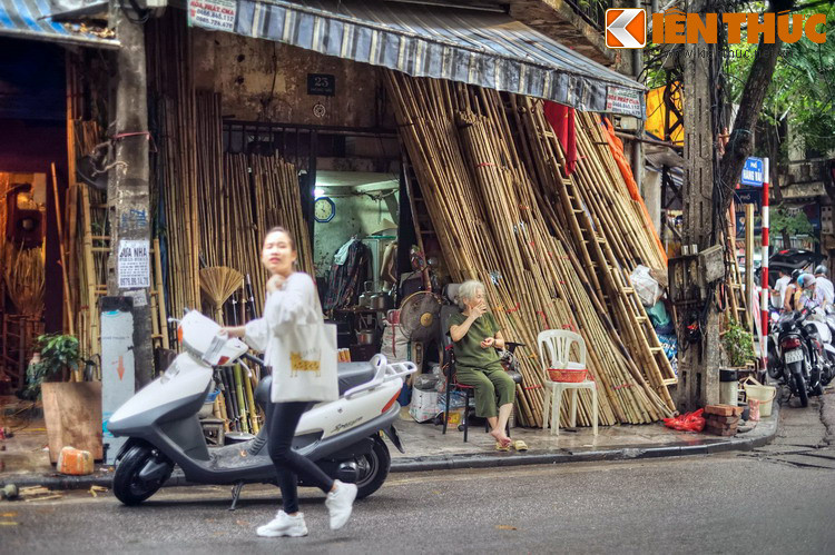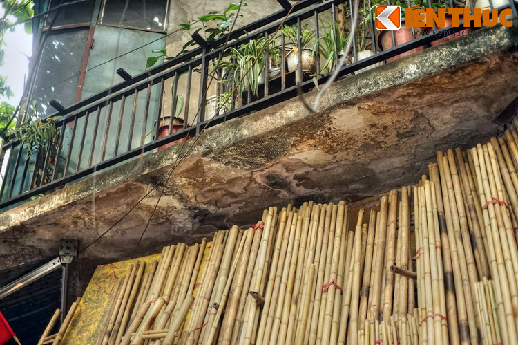 Những chiếc sào tre, thang tre cao vút được bày kín vỉa hè, che khuất cả tường nhà đã tạo nên khung cảnh “độc nhất vô nhị” cho phố Hàng Vải.