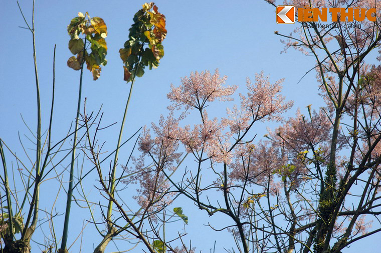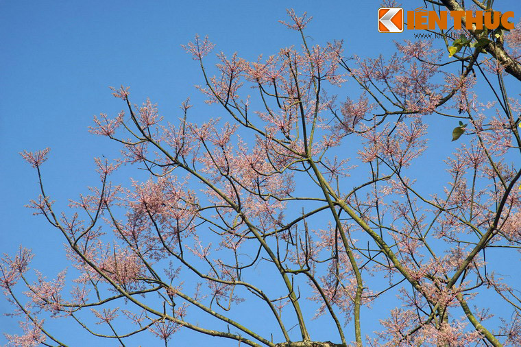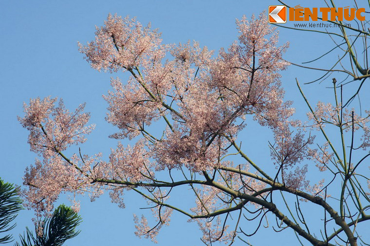 Đến kỳ đơm hoa, cây ngô đồng dần dần trút hết lá rồi phô những chùm hoa nhỏ màu hồng dày đặc, vừa rực rỡ, vừa toát lên sự thanh thoát, quý phái.