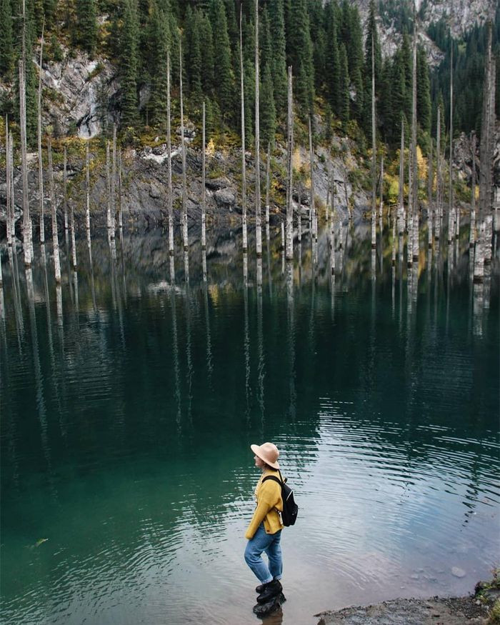 Sau thảm họa đó, cây cối bị nhấn chìm trong biển nước. Nhiều người nghĩ rằng những cây vân sam chìm dưới hồ sẽ bị chết. Thực tế, chúng vẫn sinh trưởng tốt. Rừng cây vân sam này cùng với màu xanh của nước hồ Kaindy tạo nên cảnh tượng thiên nhiên kỳ thú. Ảnh:Mariya_mahambetovna, julia_zaitsava.