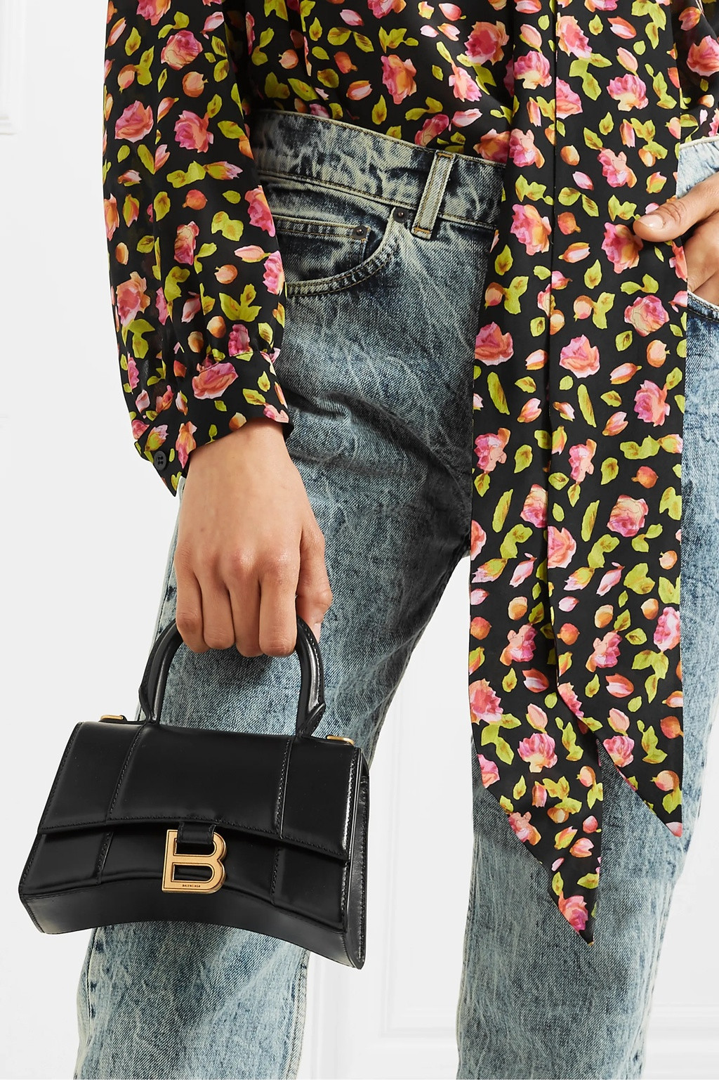 Balenciaga Hourglass XS Top Handle Bag (1.590 USD): Túi phối tông màu đen tối giản, phía trước gắn kết phụ kiện chữ B bằng kim loại sang trọng. Ngoài sử dụng theo cách cầm trên tay như trong ảnh, sản phẩm này còn trang bị thêm dây quai để đeo trên vai hoặc đeo chéo qua người. Ảnh: Net-a-Porter, Harvey Nichols.