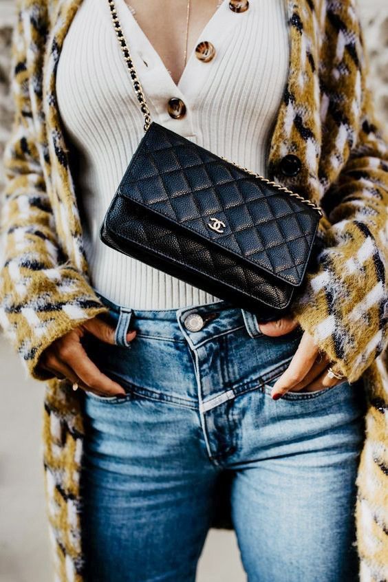 Chanel Wallet On Chain (2.500 USD): Túi có nắp gập kèm dây xích cổ điển. Phần da được thiết kế dập ô mang tính biểu tượng của nhà mốt xa xỉ hàng đầu nước Pháp. Bạn có thể sử dụng túi theo nhiều kiểu như cầm tay, đeo vai hoặc đeo chéo. Dáng túi hình chữ nhật cho phép bạn đựng điện thoại iPhone 12, thỏi son, hộp phần, một ít tiền mặt và giấy tờ. Ảnh: Yourockmylife, Bikinis & Passports.