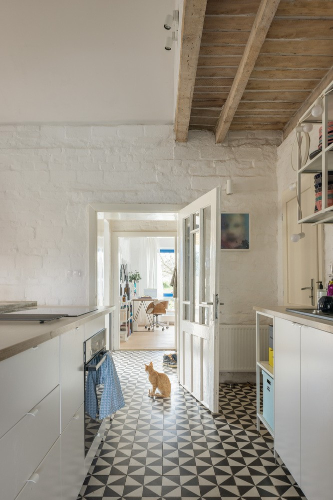 Ngôi nhà sử dụng màu sắc chủ đạo là trắng, kết hợp với nội thất bằng gỗ, kết hợp với chiếc cầu thang sắt màu xanh làm điểm nhấn.