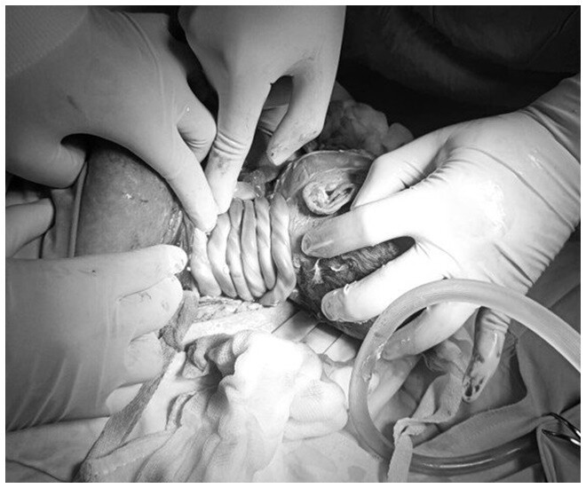Tình trạng này sẽ khiến thai nhi bị thiếu oxy trầm trọng khi ở trong bụng mẹ. Nếu không đưa thai nhi ra ngoài sớm, sẽ ảnh hưởng đến sự an toàn của hai mẹ con. Sau khi trao đổi với chị Lương và gia đình, ê kíp sản khoa quyết định ngay lập tức thực hiện mổ lấy thai để chấm dứt thai kỳ cho chị Lương.