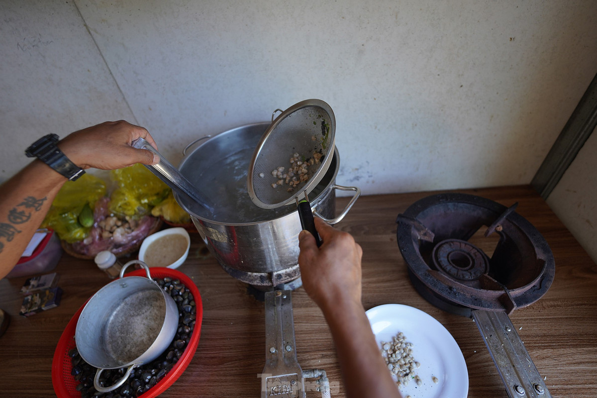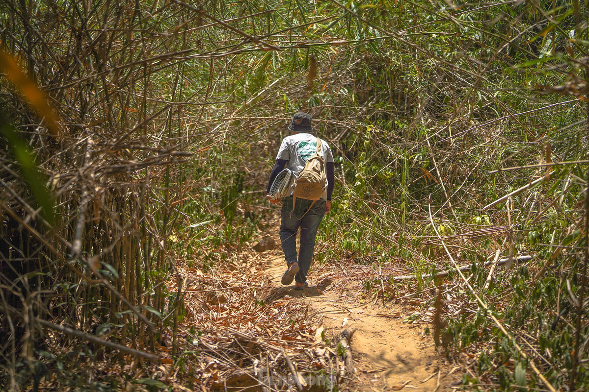 Trong khi du khách đi bộ thì đội hỗ trợ đã chuẩn bị cơm trưa. Nhóm khách trong ảnh được phục vụ món thịt lợn xông khói nướng hạt dỗi khá độc đáo của địa phương. Dòng nước suối nơi cấm trại mát lạnh đến nỗi có thể ngâm cả chai nước ngọt, đợi tầm 15 phút là có thể thưởng thức.