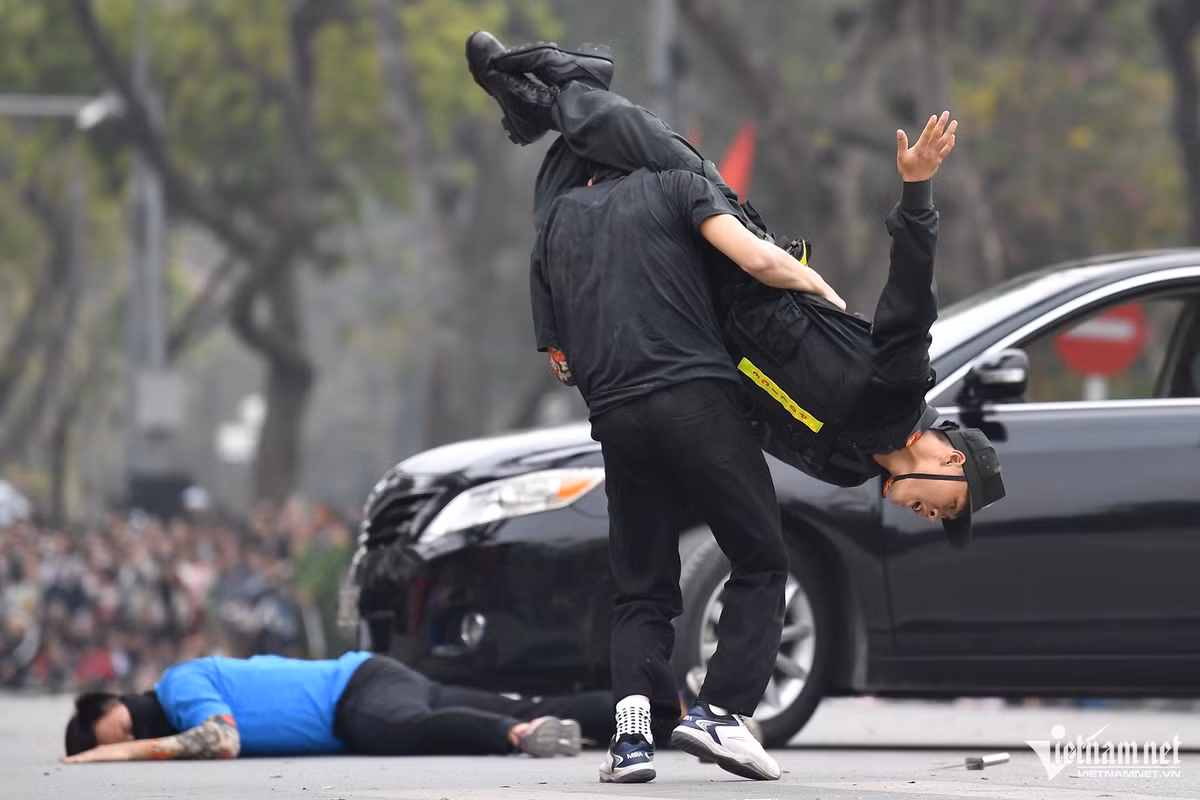 Tại buổi trình diễn khí công và tấn công tội phạm của lực lượng công an trên phố đi bộ Đinh Tiên Hoàng vừa qua, nhiều khán giả đã trầm trồ khi được chứng kiến tài năng võ thuật của các chiến sĩ Cảnh sát cơ động qua các kịch bản giao đấu với tội phạm. Một trong các tiết mục hấp dẫn đó là màn giao chiến khi tội phạm bất ngờ tấn công một chiếc ô tô nhãn hiệu Camry chở nhân vật quan trọng.