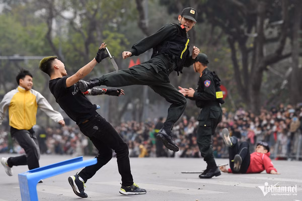 Các miếng võ như lên gối, bẻ quặt tay, bay người tung cú đá quyết định được các chiến sĩ thể hiện khéo léo trước hàng nghìn khán giả đứng hai bên phố Đinh Tiên Hoàng.